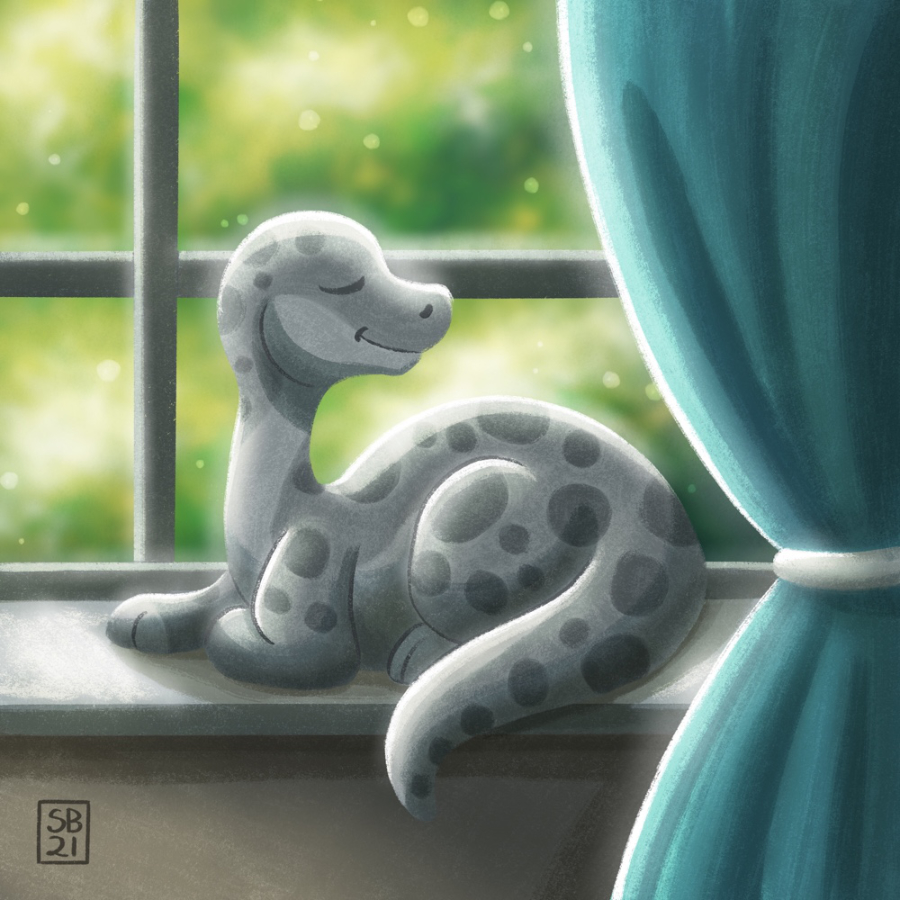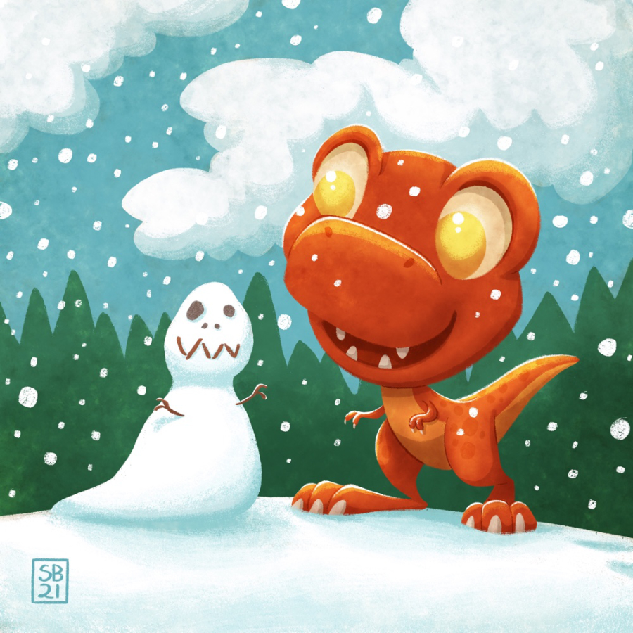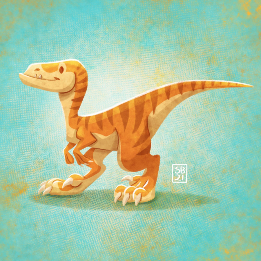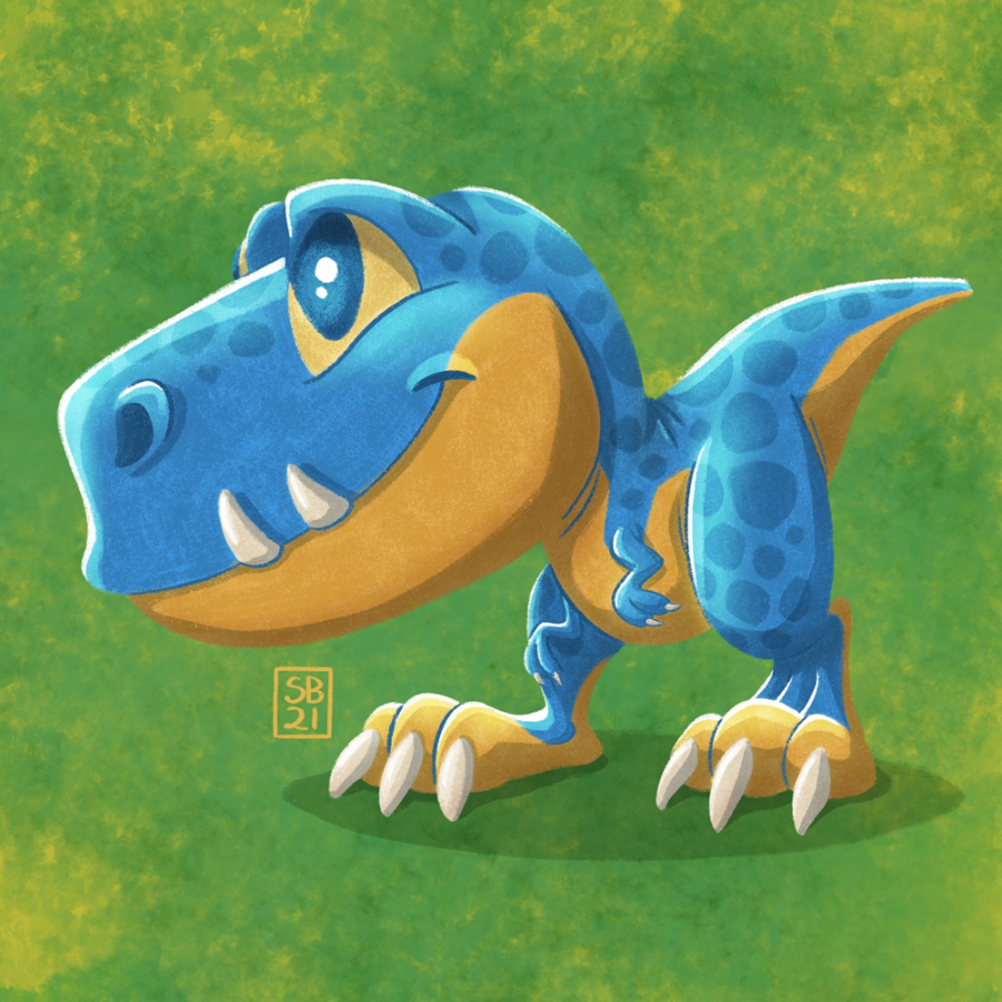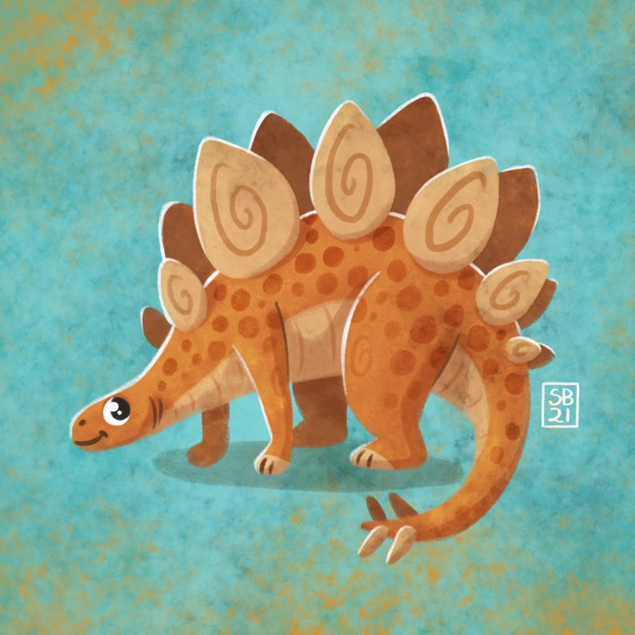 This week’s featured artist is Kentucky-based illustrator Sarah Brooks! Although her childhood friends grew out of their ‘dinosaur phase,’ Sarah’s fascination became stronger with age. Dinosaurs play a key role as subjects in her art because she takes great joy in drawing them, thanks to their interesting body forms and endless possibilities for colour and patterns. Sarah incorporates bright colours and cute, cheerful critters into her work in the hopes of one day illustrating children’s books. She wishes she could own a baby dinosaur as a pet, so her illustrations are cartoon-based, with happy faces, large eyes, ‘cat-like paws,’ and the occasional wagging tail.